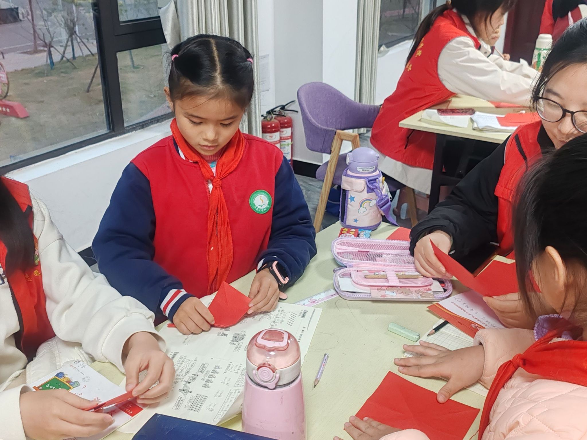 图三为志愿者与小朋友一起折爱心贴红丝带