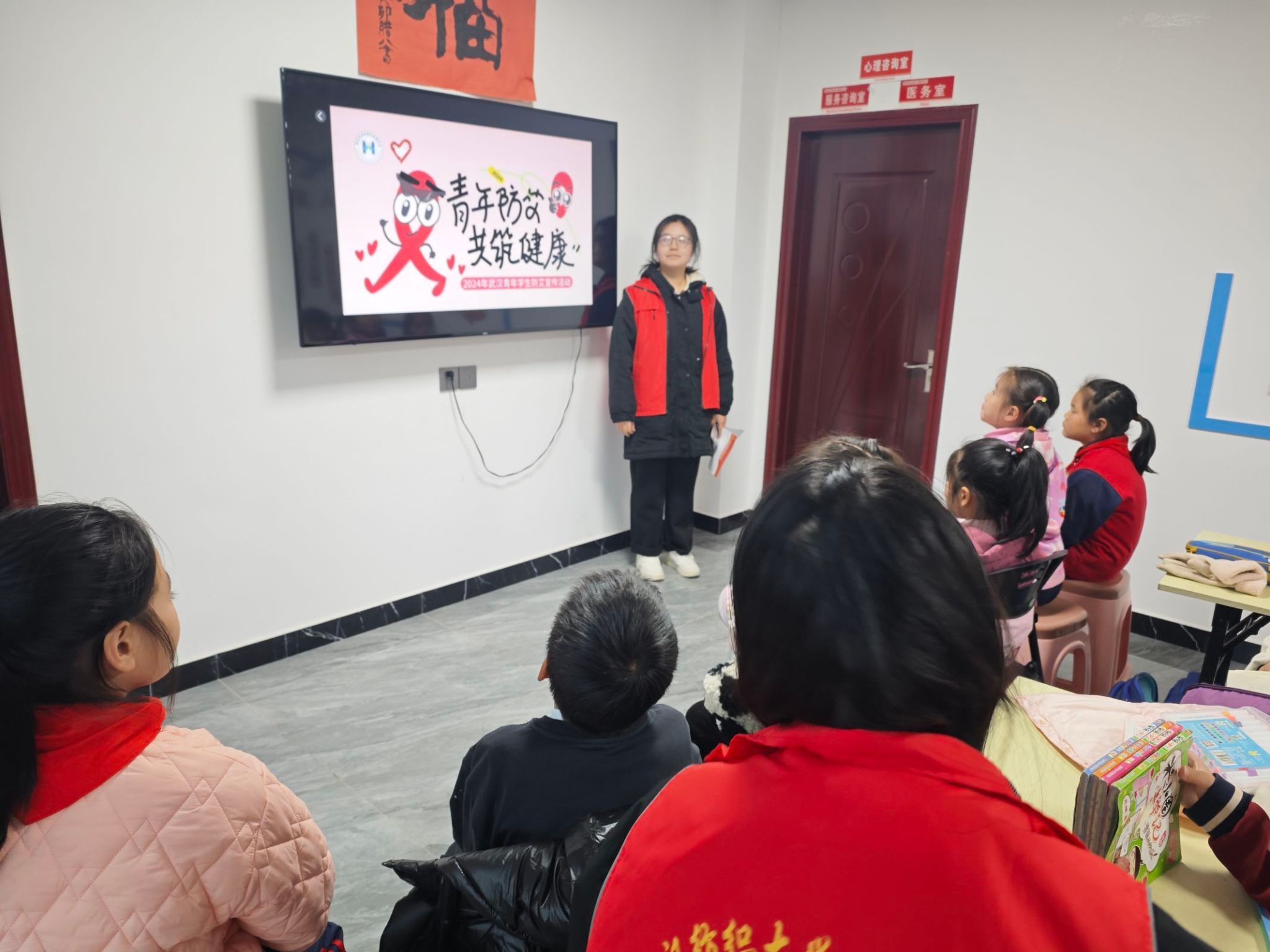 图一为志愿者面向小朋友们进行防艾知识宣讲