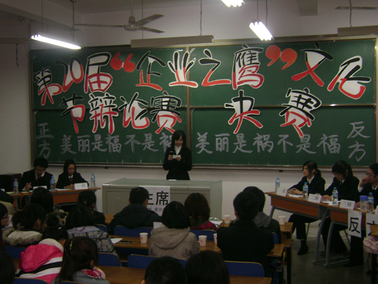 唇枪舌剑,妙语连珠。2009年11月15日晚7:00,经济365英国上市官网在线第二十届“企业之鹰”文化节辩论赛决赛在03-218教室举行。本次辩论赛由经济365英国上市官网在线分团委主办,分团委学生会学习部承办,是经管院的传统特色活动。经管院分团委书记谢超,辅导员彭慧、张学军及王娟老师为本场比赛嘉宾,比赛评委则由经管院辩论队成员担任。