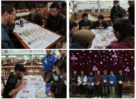 历经初赛、复赛等一个多星期的赛时,最终跳棋、五子棋、象棋、三国杀四个项目的前四强齐聚一堂,在众人的见证下,以棋会友、增强交流。决赛除三国杀采用一局制外,其余棋种均采用三局两胜制。时而苦思冥想、反复琢磨,时而谨慎万分、精巧布局,更有三国杀,挑战着同学们之间团结协作、察言观色的能力。比赛现场气氛热烈,各参赛选手相互较置,毫不示弱。不仅引起了过路同学们的围观,更吸引了外国留学生的驻足观战。最终,熊康同学摘取五子棋冠军,黄彬同学荣获跳棋冠军,廖源泉同学荣获象棋冠军,黄峥、赵勇志、潘荣嵘三人组成的团队荣获三国杀冠军。