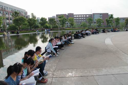 365英国上市官网在线图书馆前有一个巨大的圆形广场,今天上午七点半,上百名学生突然出现在这里,他们很快围成了一个圆圈,圆圈内上百名学生排列成一个大大的“书”字。队形排好后,所有的学生都拿出一本书大声朗读起来。他们有的读英语,有的读《论语》,有的读诗歌,有的读专业书籍,忘我地沉浸在阅读的快乐中。此时正好是学生去教室上课的时间,所有途经这里去往教室的学生都被他们庞大的气势和郎朗的读书声所吸引,他们好奇地围观,一些同学恍然大悟地想起原来今天是世界读书日!十五分钟后,读书的人群突然散去,刚才还书声朗朗的广场恢复了安静,“快闪”行动到此结束。