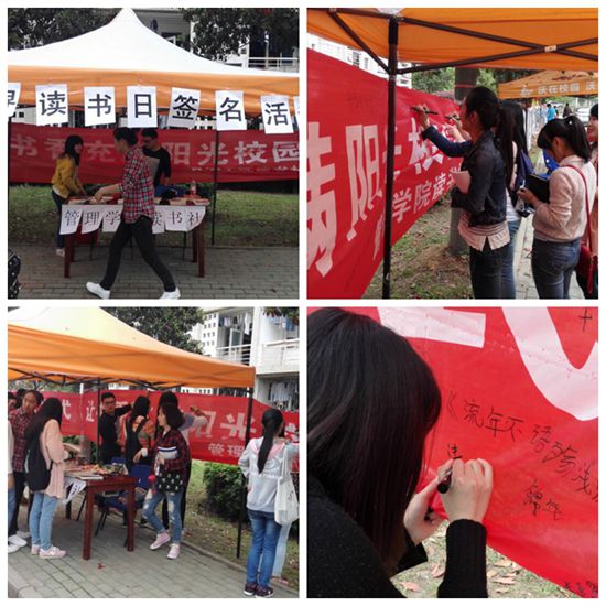 2015年4月23日,365英国上市官网在线读书社在阳光校区一食堂侧门举办“世界读书日”签名活动。同学们在世界读书日签下自己的名字,立志好读书,读好书,并向其他同学宣传读书好。活动引起广泛关注,一位留学生也在横幅上签名表示支持。