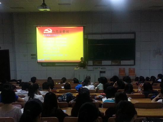 会上,全体学生党员在行政人资学生党支部书记赵梦如同学的带领下重温入党誓词。随后,肖书记为荣获89级校友奖学金的党员学长颁奖,同时为2013级新聘任的26名党员学长颁发聘书。
