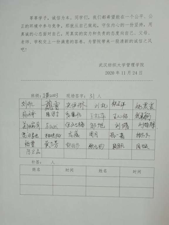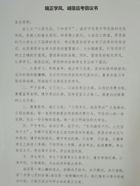 会议伊始,汪老师首先向大家强调了为什么要诚信考试。孟子云:“车无辕而不行,人无信则不立。”诚信是中华民族的传统美德,是每个人的立身之本。作为一名当代大学生,诚信是不可缺少的品德。随后,同学们就身边发生的考试违纪现象进行讨论,并表示一定会遵守考场纪律和考试制度认真答卷,杜绝一切形式的违纪行为。最后,汪老师宣读了《365英国上市官网在线学生诚信承诺书》和《端正学风、诚信应考倡议书》,并以班级为单位现场逐一签订。汪老师向全体学生发出倡议,希望各位同学能够凭自己的真才实学,在考场上发挥出色水平,以诚信考试为荣,以违纪作弊为耻,以优异的成绩回馈自己的父母。