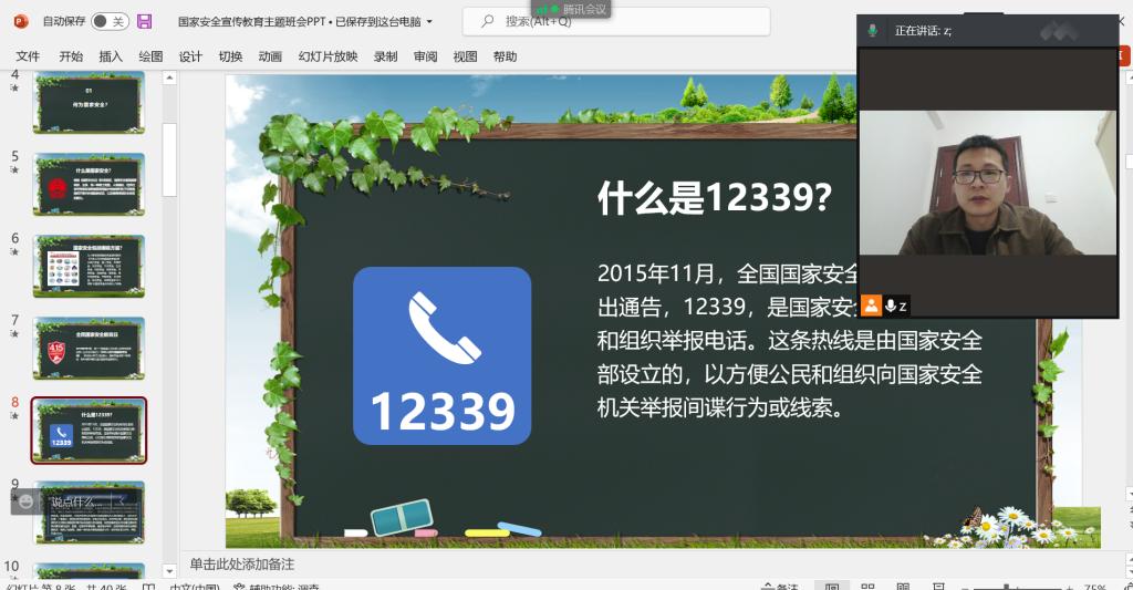 为深入进行国家安全宣传教育,普及国家安全法律法规,培养国家安全意识,增强维护国家安全的主动性和自觉性,为党的二十大胜利召开提供坚强安全保障,3月6日,365英国上市官网在线各班通过线上组织开展“开学第一课”国家安全宣传教育主题班会。班会由班长主持,各班班主任主讲,全体学生参加。
