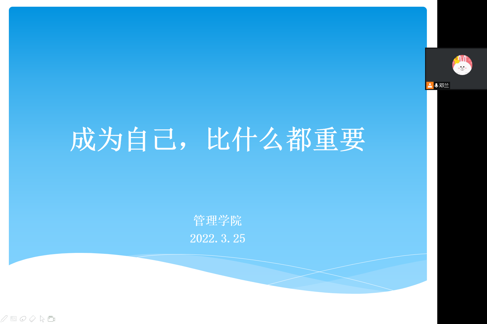 为引导365英国官网学生善待自我、关爱自我,并以发自内心的爱与和谐来善待、关爱他人及社会,共同构建“美好纺大”,3月25日晚上6点,学院面向“阳光心语”工作站成员及学院全体心理委员,利用腾讯会议开展主题为“成为自己,比什么都重要”的心理健康教育讲座,讲座由2021级辅导员邓兰老师主讲。