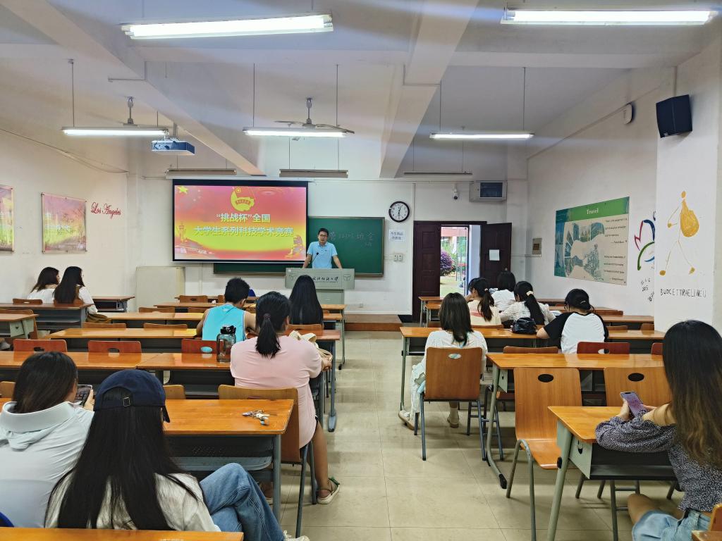 会上老师们就“挑战杯”赛事背景、大赛赛题、赛事备战等方面进行了详细解读,希望学生能够在学科竞赛中寻找不足、提升自我。邓兰介绍在第十七届“挑战杯”全国大学生课外学术科技作品竞赛中,我校斩获全国特等奖一项、全国二等奖一项、全国三等奖一项,详细为同学们介绍了优秀作品内容。张朋龙谈到此次我校承办湖北省第十四届“挑战杯•中国银行”大学生课外学术科技作品竞赛,坚持以赛促创、以赛促教、以赛促学,主动积极作为,为助力学校创新创业人才培养,推动学校高质量发展贡献蓬勃青春力量,也进一步激发了同学们知校、爱校、护校、荣校的热情。