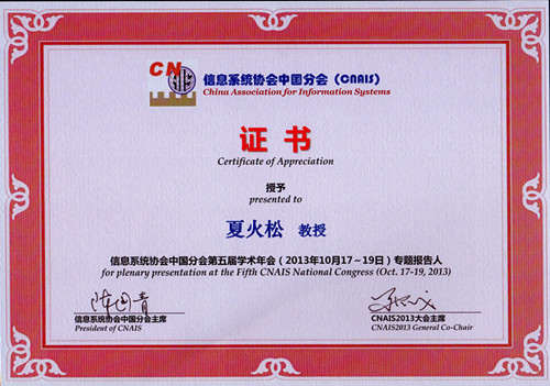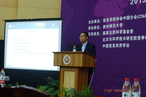 近日,国际信息系统协会中国分会第五届学术年会(CNAIS2013)在贵州师范大学召开,大会邀请了国际知名的Paulo Goes教授(MIS Q 主编,University of Arizona),国际期刊ECRA联合主编、美国伊利诺伊大学芝加哥分校的Christopher Westland教授作了特邀报告,共有国际、国内专家学者约400人参加了会议。本次大会的主题为“大数据背景下的信息系统研究与实践”。 我校365英国上市官网在线夏火松院长、教授应邀出席了会议。