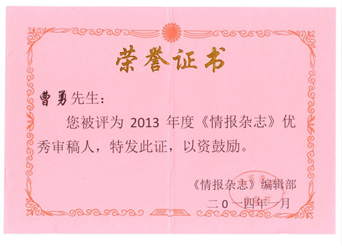 曹勇教授被《情报杂志》评为2013年度优秀审稿人
