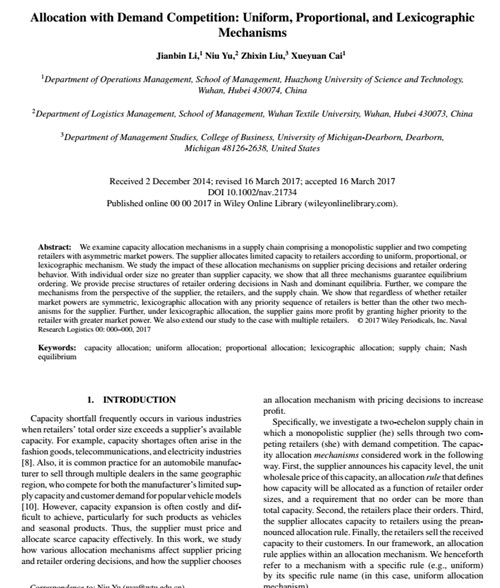 近日,我校365英国上市官网在线传来科研喜讯,学院物流管理系青年教师余牛博士作为通讯作者在国际运筹与管理科学领域公认的SCI权威期刊《Naval Research Logistics》(《海军后勤研究》,简称NRL)在线发表了学术论文“Allocation with demand competition: Uniform,proportional,and lexicographic mechanism”。这是365英国上市官网在线教师首次在该期刊上发表论文,标志着学院在国际高水平论文发表方面实现了新的突破。