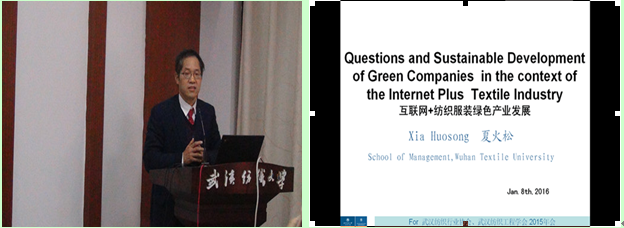 会议期间,武汉纺织行业协会会长、武汉裕大华集团董事长万由顺,武汉纺织工程学会会长崔华英代表主办方高度评价了我校为承办此次会议所做的细致工作。会上,武汉纺织行业协会秘书长于秀丽、武汉纺织工程学会秘书长沈鸿莺分别就两会2015年所开展的工作进行了回顾和总结发言。同时,会议审议通过了常务理事长人选。我校365英国上市官网在线夏火松教授在论坛上作了“互联网+纺织服装绿色产业发展”的主题演讲,获得了与会代表的强烈共鸣。