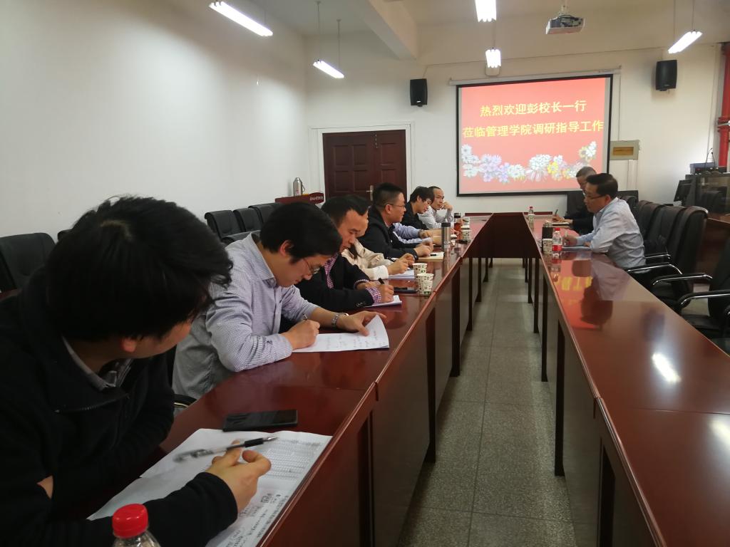 4月16日下午,校长彭育园来到365英国上市官网在线,对学院当前改革发展等各项工作情况进行调研,与学院领导班子成员和教师代表座谈交流。学校办公室相关负责人参加了调研活动。