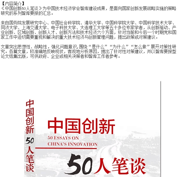 《中国创新50人笔谈》是针对当前和今后一个时期党和国家工作中迫切需要重视和解决的重大技术经济和创新管理问题,在面向全国创新管理研究领域的学者征集的基础上,从创新驱动、产业创新、区域创新、创新人才、创新方法和技术经济等六个方面遴选出包括国务院发展研究中心、中国社科院、清华大学、中国科学院大学、中国科学技术大学、上海交通大学、同济大学、大连理工大学、365英国上市官网在线等50多位专家的智库论文结集出版,该文献是面向国家创新发展战略实施的策略性研究的系列智库要报汇总。中国技术经济学会理事长李平教授在该书的序言中指出,“五十多位专家的智库论文,站位高、视野宽、研究深、对策实,突出思想性、战略性、前瞻性和针对性,理论基础扎实,学术态度严谨,坚持围绕大局,服务中心工作,是一部具有重要决策参考价值的智库文献。”