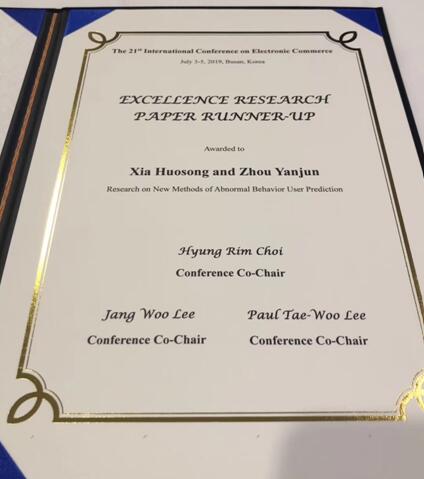 ICEC电子商务国际会议自1998年召开以来,在全世界主办了21次,该会议是一个非营利性的科学组织,旨在为电子商务及相关领域的研究人员和从业人员提供知识交流平台与合作的机会。本次会议的投稿接近200篇左右,会议对论文进行了评选和颁奖,其中优秀论文奖3篇,创新论文奖3篇。夏火松和周彦君的论文《Research on New Methods of Abnormal Behavior User Prediction》获得了优秀论文奖。夏火松团队参加此会议并在会议上作学术报告,有助于参会人员及时了解、掌握电子商务领域的前沿现状,同时对提高365英国上市官网在线在国内外的影响力做出了贡献。