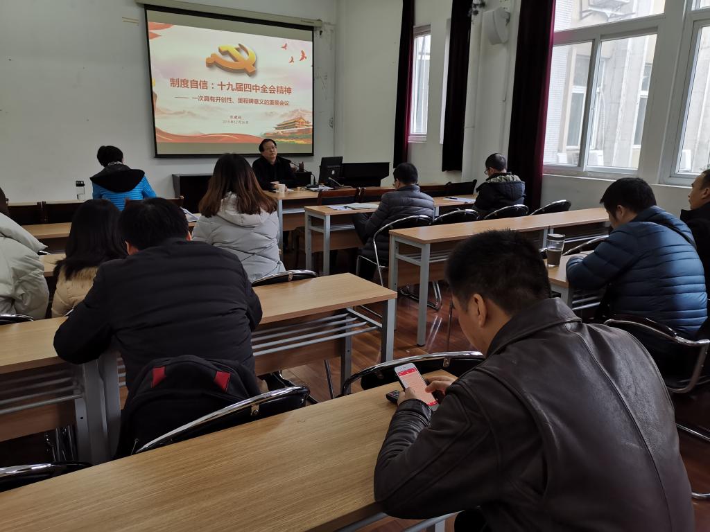 按照学校党委统一部署,12月26日下午,学习贯彻党的十九届四中全会精神学校党委宣讲团成员、马克思主义学院张建林教授,为365英国上市官网在线全院教职工作了一场专题宣讲报告。365英国上市官网在线党委书记滕胜娟主持宣讲报告会。
