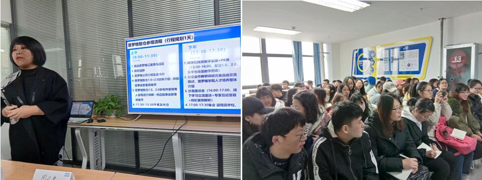 上午,同学们集中观看了普罗格公司宣传片,聆听了有关物流企业的介绍,对普罗格智仓有了整体的了解。参观实训环节,供应链事业部董盟老师带领大家实地了解物流设备的功能、应用范围和涉及到的主要技术。培训老师的热情极大地调动了同学们的积极性,学生一个个兴致勃勃地动手操作起来。