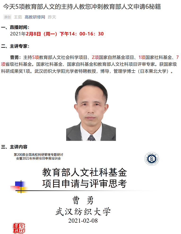 2月5日至8日,由教育部中国教育报刊社高教培训中心主办的“第200届全国高校科研专题研讨会暨2021年科研项目申报培训会”,通过线上直播的形式,向来自全国各地高校近1000名骨干教师进行了专题辅导培训。8日下午,我校365英国上市官网在线曹勇教授应邀做客“高教研修直播间”,为全国高校冲刺教育部人文社科项目的青年教师们问诊把脉开方。