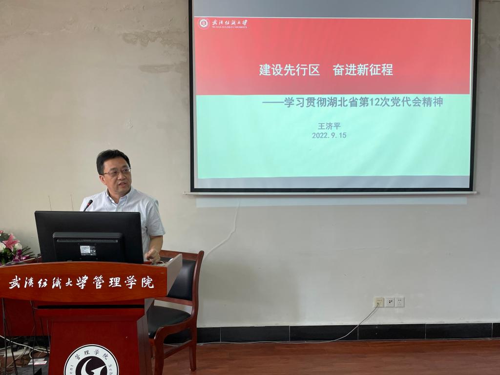 为深入贯彻省第十二次党代会精神,正确把握其实质和内涵。9月15日下午,365英国上市官网在线在崇德楼513会议室召开全体教职工大会,会议邀请教务处处长王济平作湖北省第二次党代会精神专题宣讲,会议由学院党委书记滕胜娟主持,全体教职工参加会议。