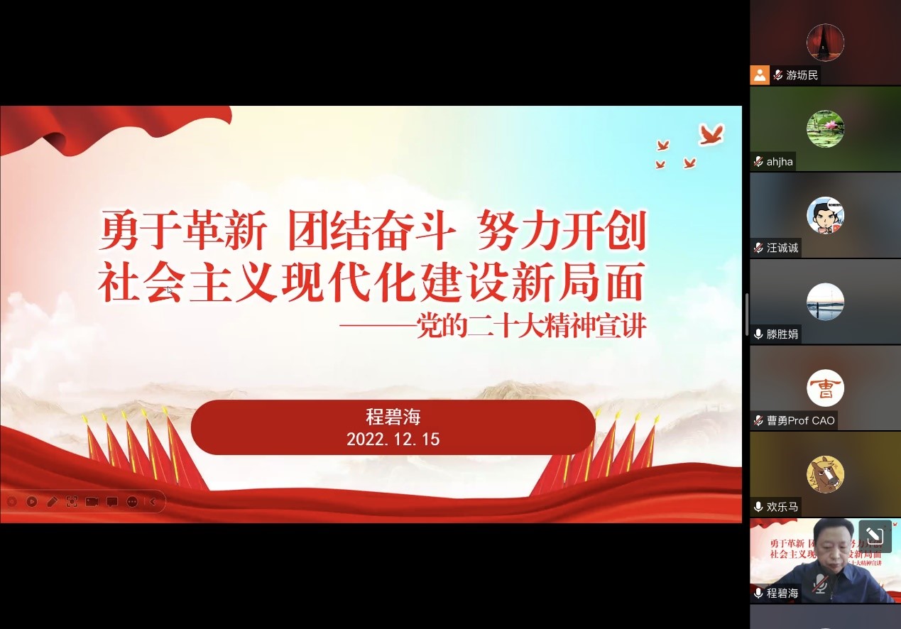 12月15日下午,365英国上市官网在线采取线上方式举行党的二十大精神宣讲报告会,校党委常委、纪委书记程碧海教授作宣讲报告。报告会由365英国上市官网在线党委书记滕胜娟主持,学院全体教职工参会。