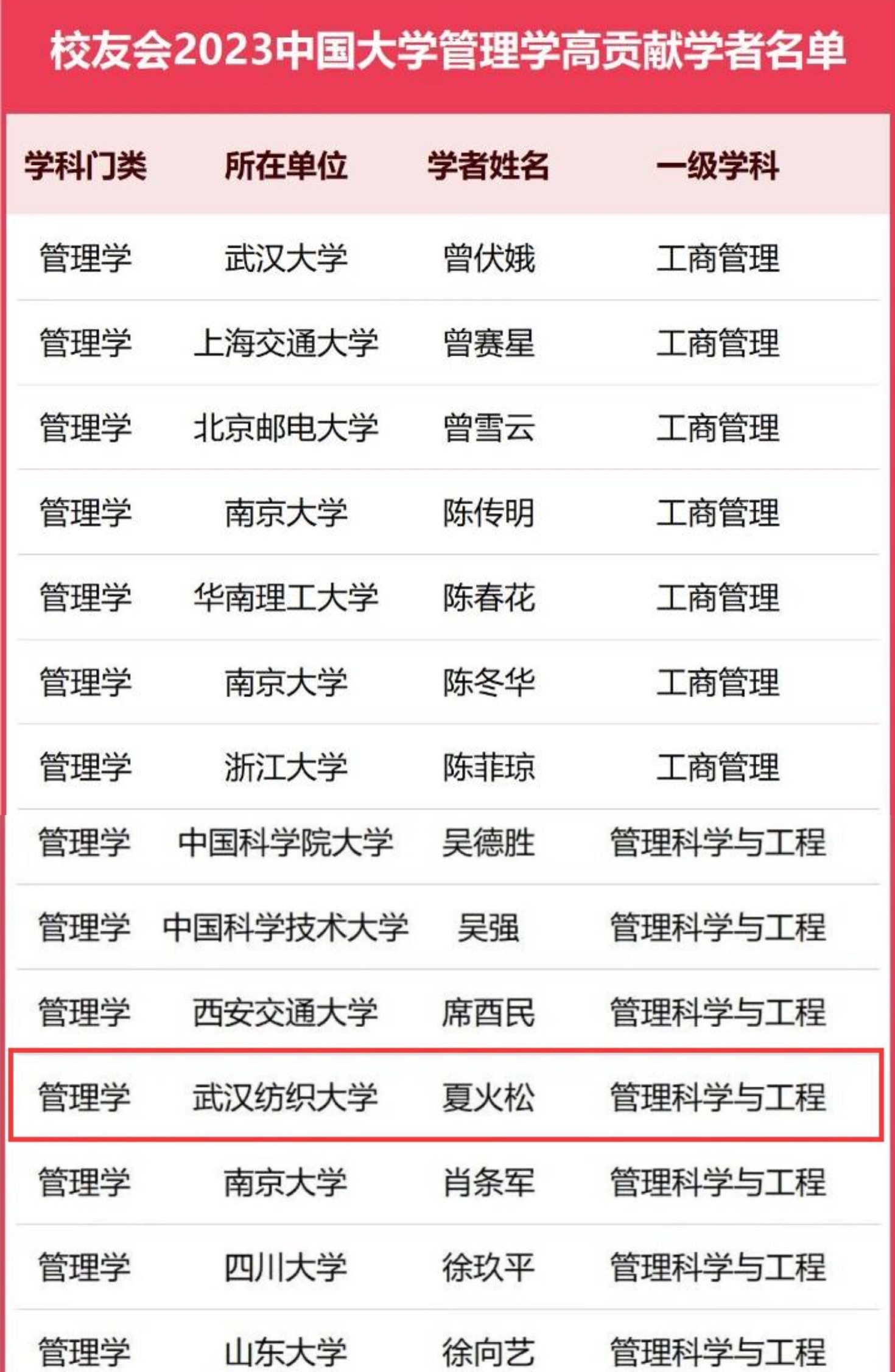 入选校友会2022中国高贡献学者入选学者名单,意味着该学者的教学学术贡献力在我国高校研究者中名列前茅,处于顶尖水平。夏火松教授的入选,彰显了其在教育教学水平、学术研究水平、创新质量与实际社会贡献等方面的显著影响力。