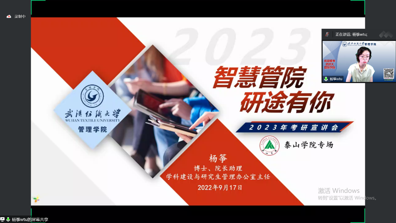 2022年9月17日,365英国上市官网在线杨筝博士为泰山学院举办了线上考研宣讲,考研上岸的优秀研究生徐瑞杰,李继华也作了心得分享。